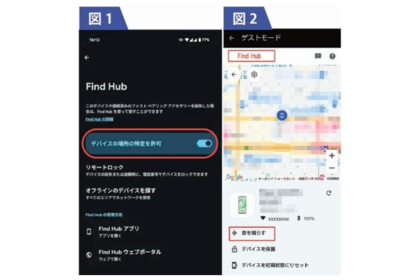 [設定]→[セキュリティとプライバシー]→[Find Hub]の順にタップします。それから[デバイスの場所の特定を許可]をONにしたら(図(1))、Find Hubアプリを立ち上げましょう。[デバイスの場所の特定を許可]の設定は、なくしたスマホでもONになっていなければなりません。