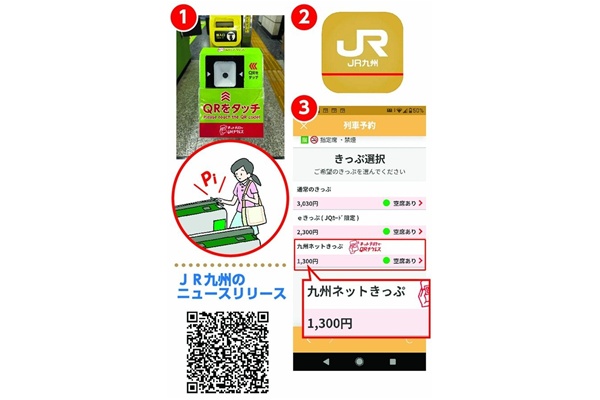 アプリを起動したら、出発駅や到着駅、乗車日、時刻、人数などの条件を設定して列車検索をします。すると条件に合った列車のきっぷ選択画面が表示されるので、その中から「九州ネットきっぷ」を選択して、画面の指示に従ってQRチケットを発行します。発行の一連の流れは、JR九州のニュースリリース(QRコード参照)に写真付きで丁寧に解説されているので、そちらを参考にしてください。